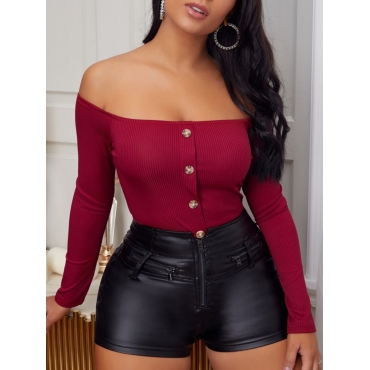 Lovely Casual Off The Shoulder Button Design Wine Red Bodysuit
