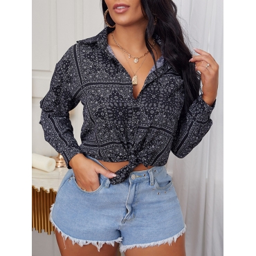 Lovely Stylish Turndown Collar Print Loose Black Shirt
