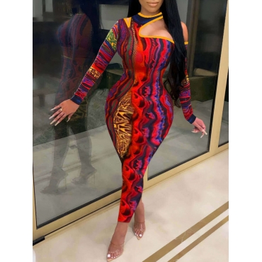 Lovely Trendy One Shoulder Print Patchwork Red One-piece Jumpsuit