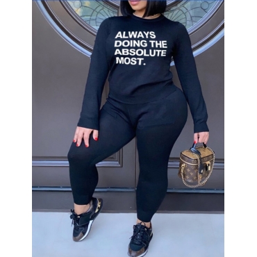 Lovely Casual O Neck Letter Print Black Plus Size Two-piece Pants Set