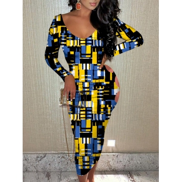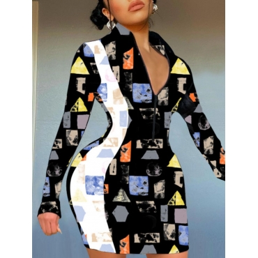 Lovely Color Geometry Casual Geometric Print Patchwork Black Mini Dress(No-positioning Printing)