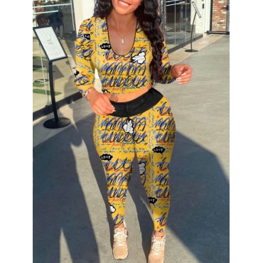 Lovely Graffiti Series Street U Neck Graffiti Print Yellow Two Piece Pants Set(No-positioning Printing)