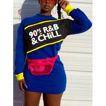 Lovely Contrast Color Street Letter Print Patchwork Blue Mini Dress(No-positioning Printing)