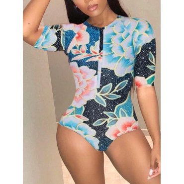 Lovely Bohemian O Neck Print Blue One-piece Swimsuit