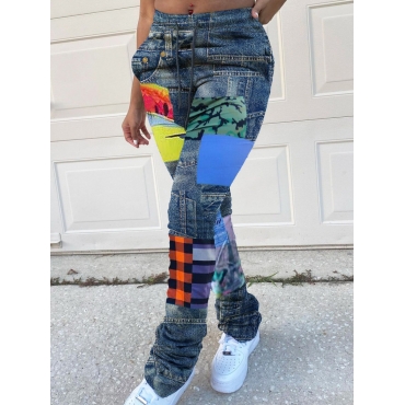 Lovely Street Plaid Print Patchwork Blue Pants
