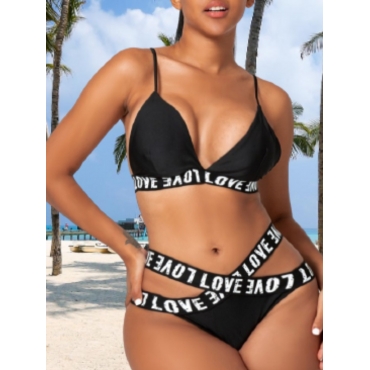 Lovely Sexy Letter Print Hollow-out Black Two-piece Swimsuit