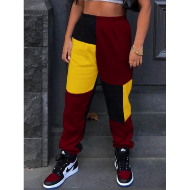 Lovely Street Color-lump Patchwork Wine Red Pants
