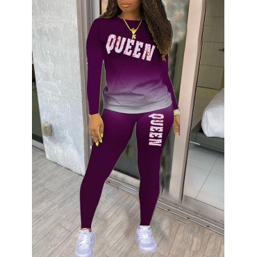 Lovely Casual Gradient Letter Print Purple Two Piece Pants Set