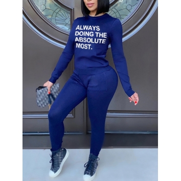 Lovely Trendy O Neck Letter Print Royalblue Two Piece Pants Set