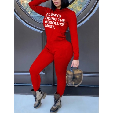 Lovely Trendy O Neck Letter Print Red Two Piece Pants Set