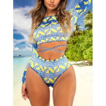 Lovely Sexy Geometric Print Patchwork Blue Tankini