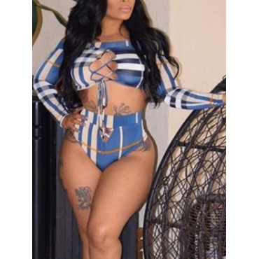 Lovely Stylish Plaid Print Bandage Hollow-out Design Blue Tankini