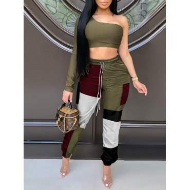 Lovely Sweet One Shoulder Color-lump Patchwork Army Green Two Piece Pants Set