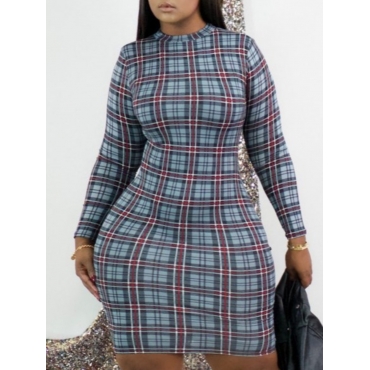 Lovely Sweet O Neck Plaid Print Blue Knee Length Dress(No-positioning Printing)