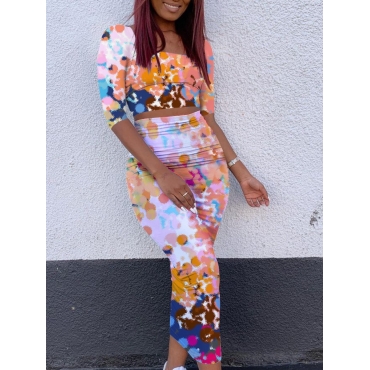 Lovely Rainbow Dots Sweet Square Collar Half Sleeve Print Multicolor Two Piece Skirt Set