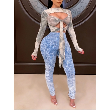 Lovely Sexy O Neck Print Hollow-out Blue Two Piece Pants Set