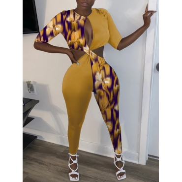 Lovely Chic Hollow-out Print Patchwork Yellow One-piece Jumpsuit(No-positioning Printing)