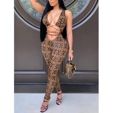 Lovely Sexy Deep V Neck Print Hollow-out Black One-piece Jumpsuit