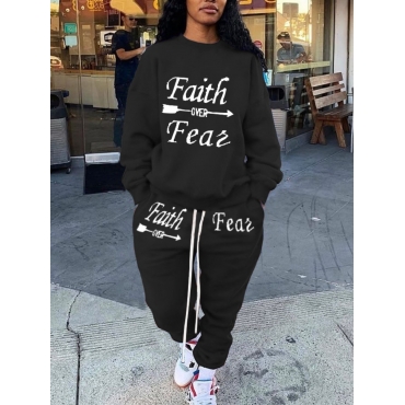 Lovely Casual O Neck Letter Print Black Plus Size Two-piece Pants Set