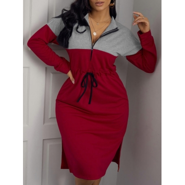 Lovely Casual Drawstring Side Slit Patchwork Red Knee Length Dress