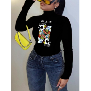 Lovely Casual Turtleneck Card Print Black Plus Size T-shirt