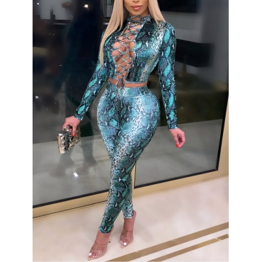 Lovely Sexy Cobra Print Bandage Hollow-out Design Blue Two Piece Pants Set
