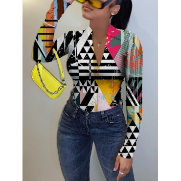 Lovely Abstract Geometry Casual Mandarin Collar Geometric Print Black T-shirt