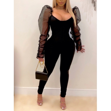 Lovely Sexy See-through Ruffle Design Patchwork Black One-piece Jumpsuit
