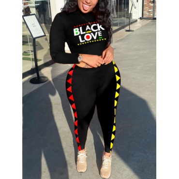Lovely Trendy Turtleneck Letter Print Patchwork Black Two Piece Pants Set