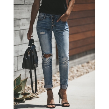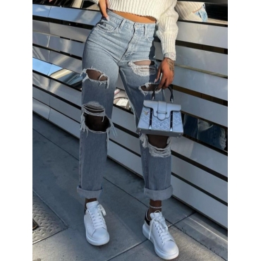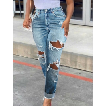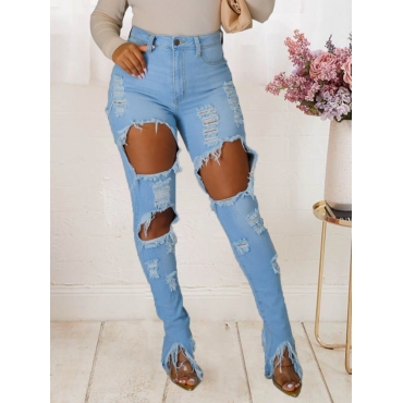 Lovely Casual High-waisted Broken Holes Baby Blue Jeans