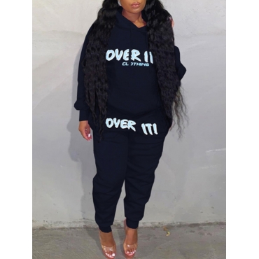 Lovely Casual Hooded Collar Letter Print Black Two Piece Pants Set