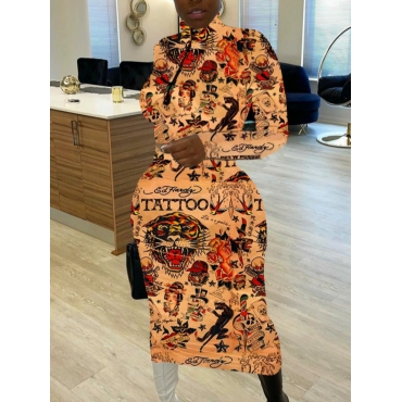 Lovely Casual Letter Print Patchwork Brown Mid Calf Dress