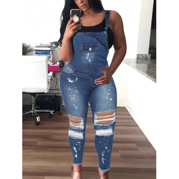 Lovely Street Broken Holes Deep Blue Denim One-piece Jumpsuits