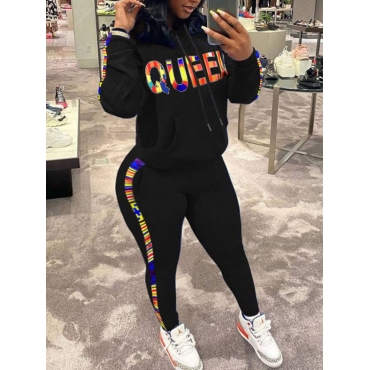 Lovely Sportswear Letter Print Striped Patchwork Black Plus Size Two-piece Pants Set
