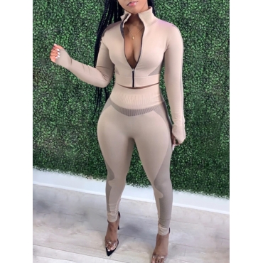 Lovely Sportswear Print Patchwork Zipper Design Apricot Two Piece Pants Set