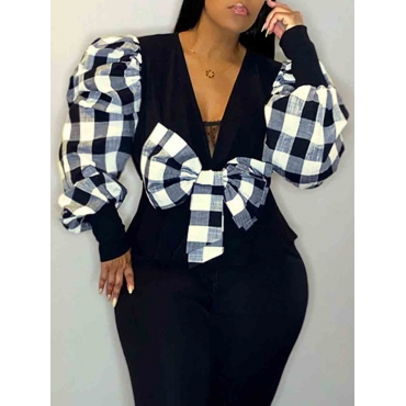Lovely Stylish Plaid Ruffle Design Black And White Plus Size Blouse