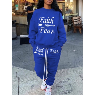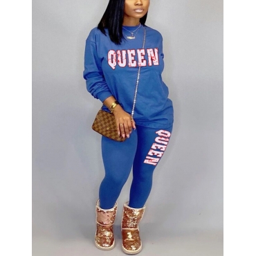 Lovely Casual O Neck Letter Print Blue Plus Size Two-piece Pants Set