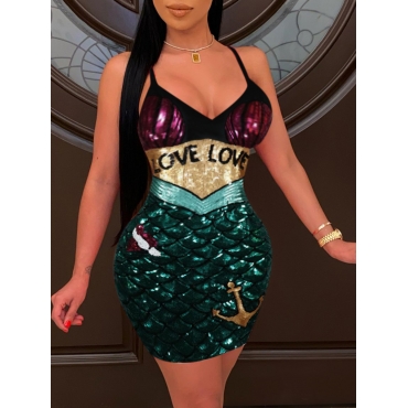 Lovely Sexy Sequined Letter Print Green Mini Evening Dress