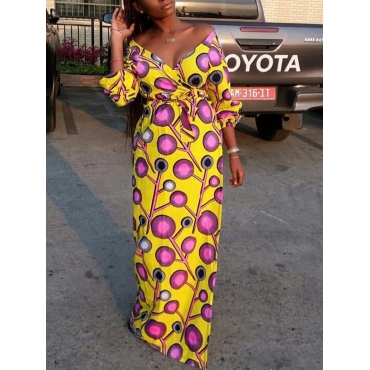 Lovely Stylish Lace-up Print Patchwork Yellow Floor Length Dress