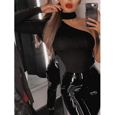 Lovely Sexy Turtleneck One Shoulder Black Bodysuit