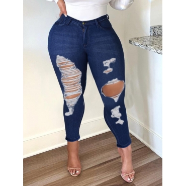 Lovely Street High-waisted Broken Holes Deep Blue Jeans