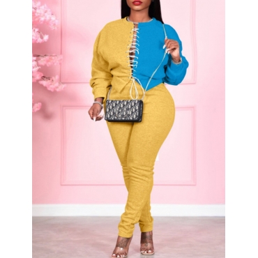 Lovely Street Bandage Hollow-out Design Patchwork Yellow Two Piece Pants Set