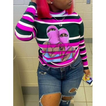 Lovely Casual Half A Turtleneck Striped Print Rose Red T-shirt