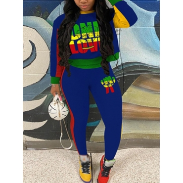 Lovely Sportswear O Neck Color-lump Patchwork Blue Two Piece Pants Set