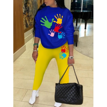 Lovely Casual O Neck Print Blue Two Piece Pants Set