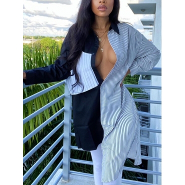 Lovely Stylish Turndown Collar Striped Stitching Black Blouse