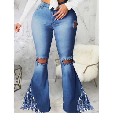 Lovely Street Flared Broken Holes Tassel Design Deep Blue Jeans