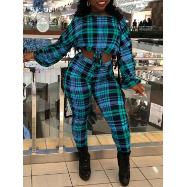 Lovely Casual O Neck Plaid Print Blue Two Piece Pants Set
