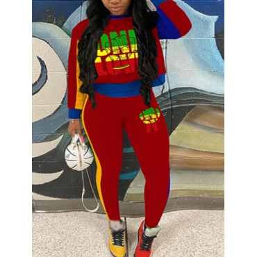 Lovely Sportswear O Neck Color-lump Patchwork Red Two Piece Pants Set