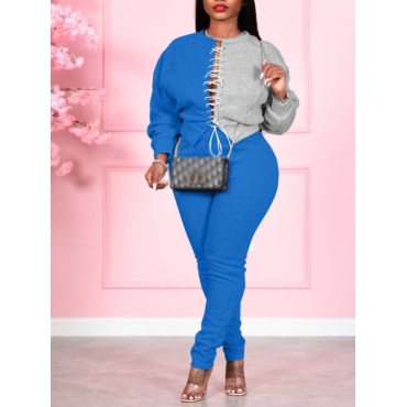 Lovely Street Bandage Hollow-out Design Patchwork Blue Two Piece Pants Set